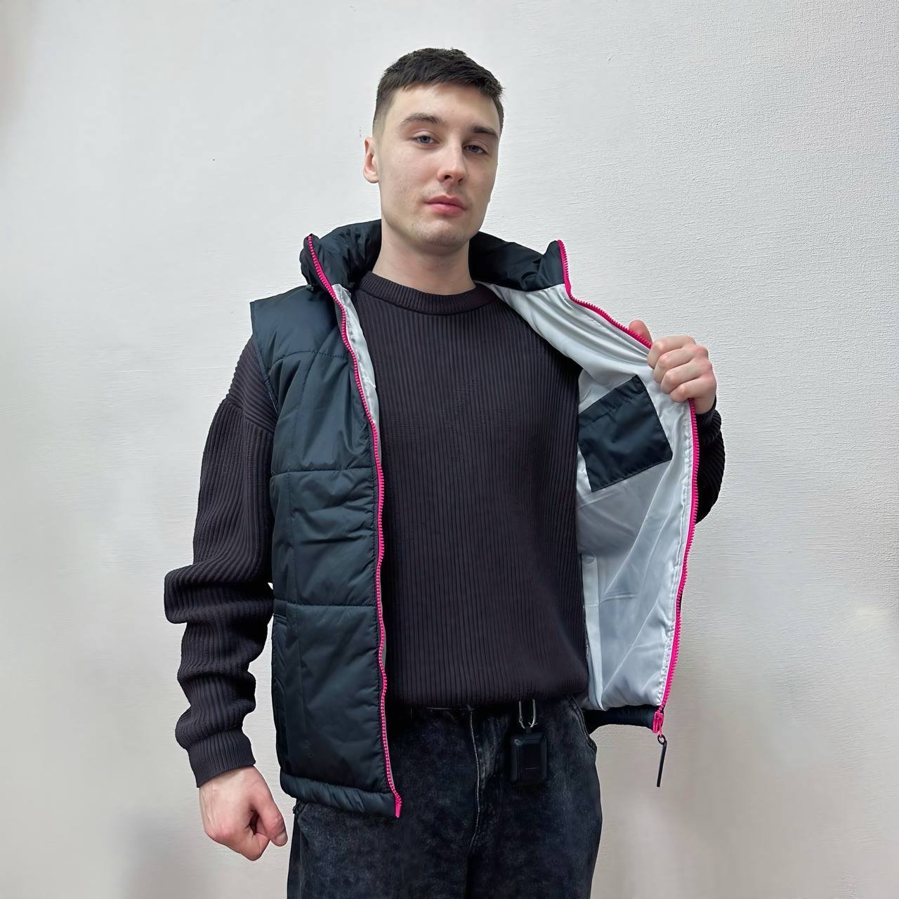 В результате получился черный утепленный жилет с яркими акцентами и продуманными деталями:— контрастная малиновая молния