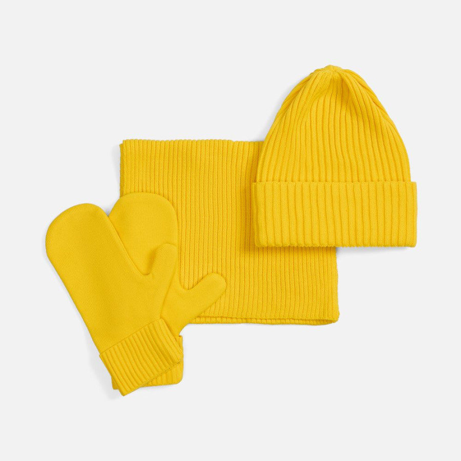 В набор входят удобный шарф с технологичным отверстием для быстрого завязывания, шапка с двойным отворотом и теплые двухслойные варежки с широкой манжетой. Все изделия связаны из акриловой пряжи, отличаются практичностью и элегантной простотой.