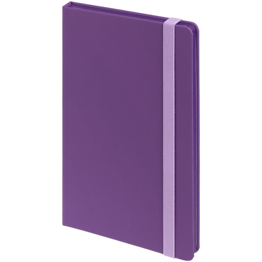 Блокнот в твердой обложке, выполнен из материала Soft Touch, фиолетовый UU, дополнен резинкой и ляссе в цвет обложки.