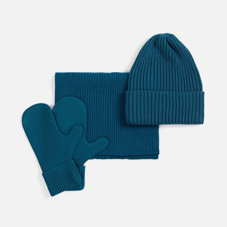 В набор входят удобный шарф с технологичным отверстием для быстрого завязывания, шапка с двойным отворотом и теплые двухслойные варежки с широкой манжетой. Все изделия связаны из акриловой пряжи, отличаются практичностью и элегантной простотой.