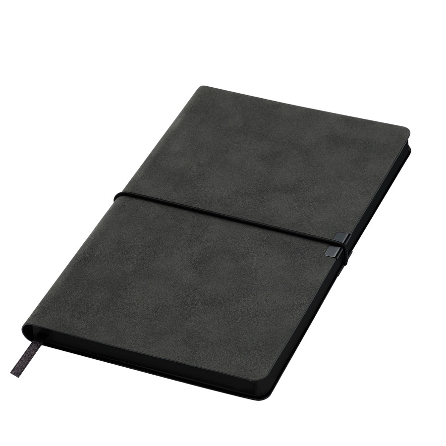 Горизонтальная резинка, фиксирующая обложку, дополнена металлическими элементами, которые не только защищают обложку от повреждений, но и служат стильным акцентом. Матовый срез в тон обложки и светло-кремовые страницы из гладкого, слегка шелковистого офсета подчеркивают изысканность дизайна. Атласное ляссе гармонично завершает образ этого элегантного ежедневника. —