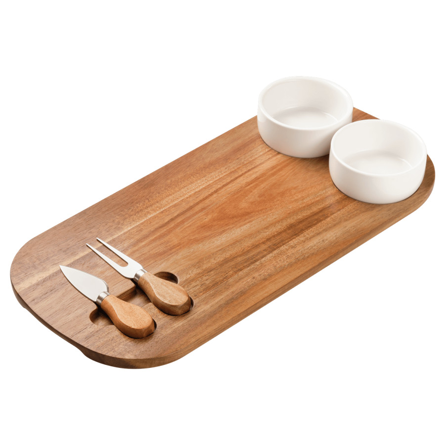 Набор предназначен для сервировки сыров и других закусок, а керамические соусницы идеально подойдут для меда, варенья или орехов.