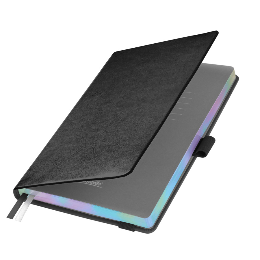 Недатированный ежедневник в жесткой обложке из качественной искусственной кожи. Материал обложки гладкий, текстурированный, с полуглянцевым блеском. Скругленные углы обложки и внутреннего блока. Отличительная особенность коллекции — голографический фольгированный срез блока. Форзац/нахзац– серые. Вариант в жесткой обложке украшен широкой вертикальной резинкой-фиксатором с вставкой из ПУ-материала обложки и петелькой под ручку, а также двойным ляссе (серым и в тон обложки).